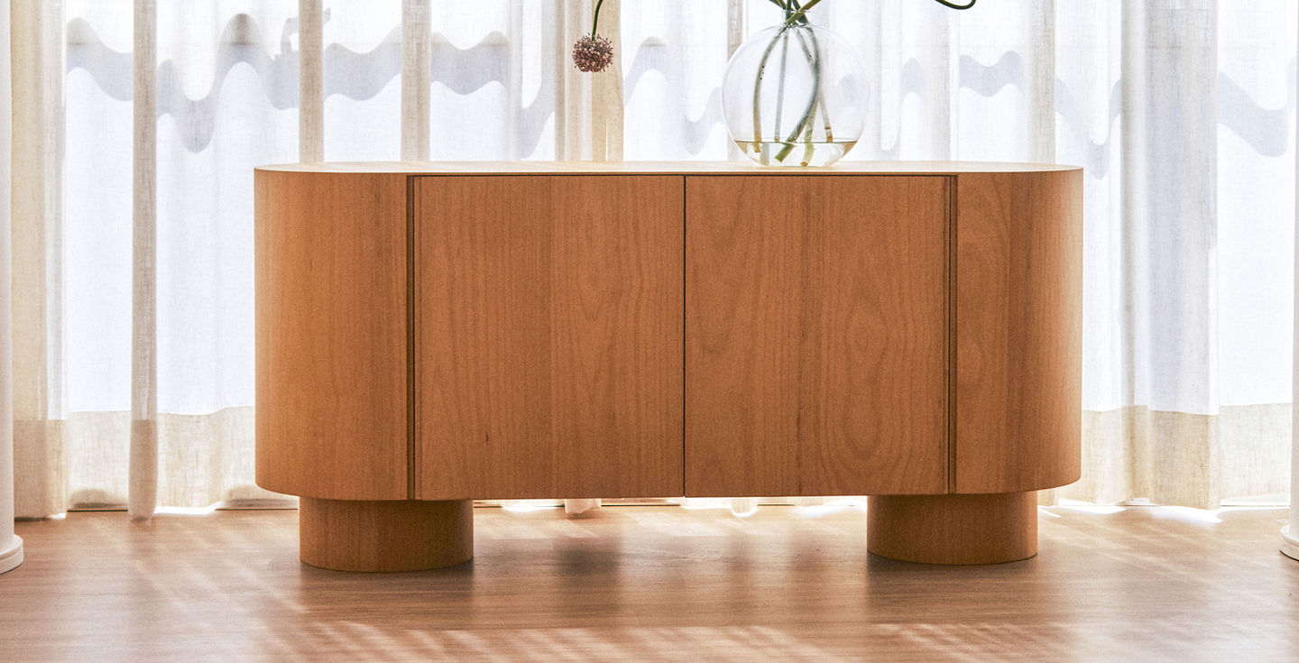 Além do interior colorido, o buffet Mancha é construído em compensado e seu formato oblongo foi pensado para conferir movimento com simplicidade ao móvel. Os pés em aço carbono também se valem de arcos para garantir leveza e estabilidade à peça.